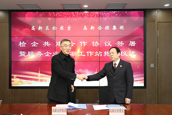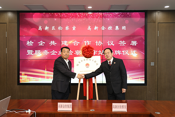 12月15日,高新金控集团与西安市人民检察院高新区检察室顺利举行“检企共建合作协议签署暨服务企业检察工作站揭牌”活动。高新金控集团党委书记、董事长杜万坤,西安市人民检察院高新区检察室负责人朱空讲话并揭牌。高新金控集团党委副书记、总经理胡炘主持,纪委书记、监事会主席王文伟,党委委员、董事贺虎善出席,各公司、各部门负责人参加。